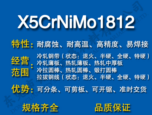 銘東金屬X5CrNiMo1812是一種超低碳奧氏體不銹鋼鋼,X5CrNiMo1812比X5CrNiMo1810耐晶間腐蝕性好。X5CrNiMo1812不銹鋼焊接性能良好,適合多層焊,焊后無刀口腐蝕傾向,對亞硫酸、硫酸、磷酸、醋酸、甲酸、氯鹽、鹵素、亞硫酸鹽均有良好的耐蝕性。該不銹鋼有良好的冷、熱加工性能,鋼的熱塑性良好,過熱敏感性低,適宜的熱加工溫度為900~1000℃。