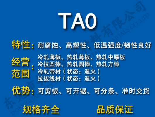 TA0工業(yè)純鈦和化學(xué)純鈦的不同之處是,它含有較多量的氧、氮、碳及多種其他雜質(zhì)元素(如鐵、硅等),它實質(zhì)上是一種低合金含量的鈦合金。與化學(xué)純鈦相比,由于含有較多的雜質(zhì)元素后其強(qiáng)度大大提高,它的力學(xué)性能和化學(xué)性能與不銹鋼相似(但和鈦合金比,強(qiáng)度仍然較低)。工業(yè)純鈦的特點:強(qiáng)度不高,但塑性好,易于加工成形,沖壓、焊接、可切削加工性能良好;在大氣、海水、濕氯氣及氧化性、中性弱還原性介質(zhì)中具有良好的耐蝕性,抗氧化性優(yōu)于大多數(shù)奧氏體不銹鋼;但耐熱性較差,使用溫度不宜太高。